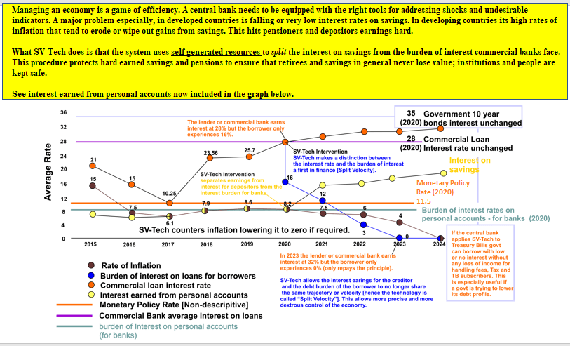A Spit Velocity model generates its own internal resources with which to separate [split] the burden of interest on savings faced by commercial banks from the interest on savings required by pensioners and savers [hence the innovation is called Split Velocity]. The SV-Tech intervention is shown in the graph above. This allows pensioners, annuities and savings to enjoy an interest rate above the inflation rate and well above low interest rates, protecting them from bearing the negative repercussions of any action a central bank needs to take to revive the economy. The sacrifices made by people to save their income is recognized by the economy and actively safeguarded. This enhancement ensures that pension schemes are protected and will never be allowed by the economy to lose the value retirees require to cover their present and future living expenses.