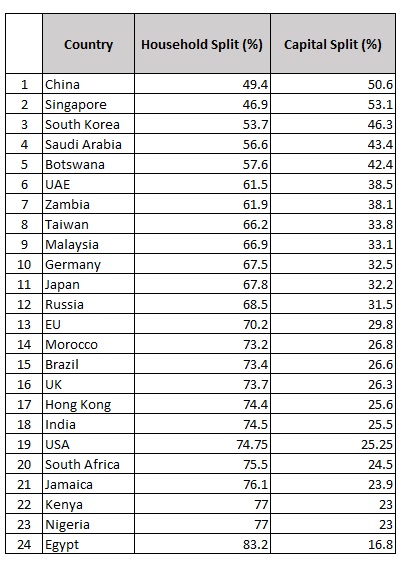Split Velocity requires countries to aim for a 50:50 balanced or “ying and yang” like split between Households and Capital, or to where the split is heavier on the Capital side in order for the availability of resources in an economy to adequately satisfy a population. However, an emphasis is placed on balance since a situation where Capital overwhelms Households can also have negative socio-economic effects on a population.