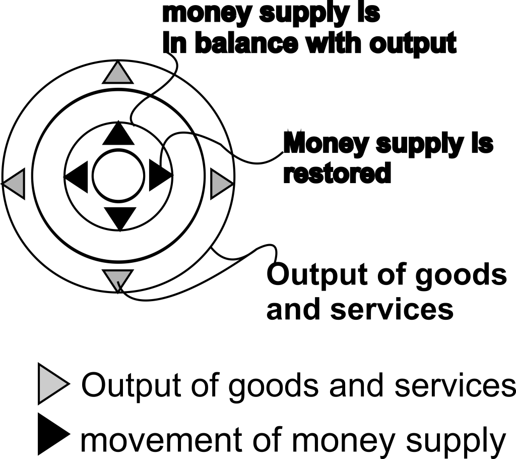 The output of wholesale and retail goods entering the economy is balanced by money supply provided by the money supply industry. See “operationalising the money supply industry” below. Output or goods in circulation being churned out by the capital economy must be constantly balanced by money supply to the household economy to seek and maintain constant price. This money supply deficit, which will annually be equivalent to GDP means the money supply industry is essential and has to supply the e-currency to keep up with this output and growth.
