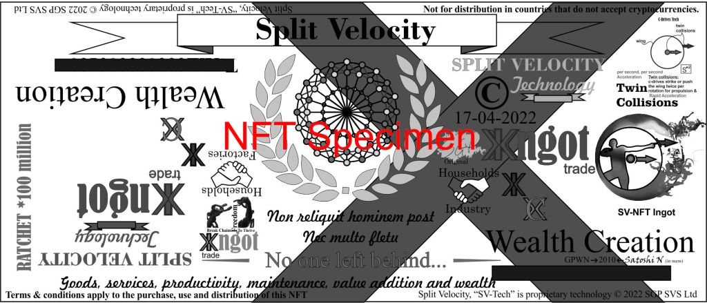 Split Velocity Solutions Ltd is issuing NFTs, referred to as Ingots to raise the resources with which to establish a Split Velocity economic network that implements an end user product called Wealth Creation that recovers the resources being lost to subtraction and to raise awareness about the problem.